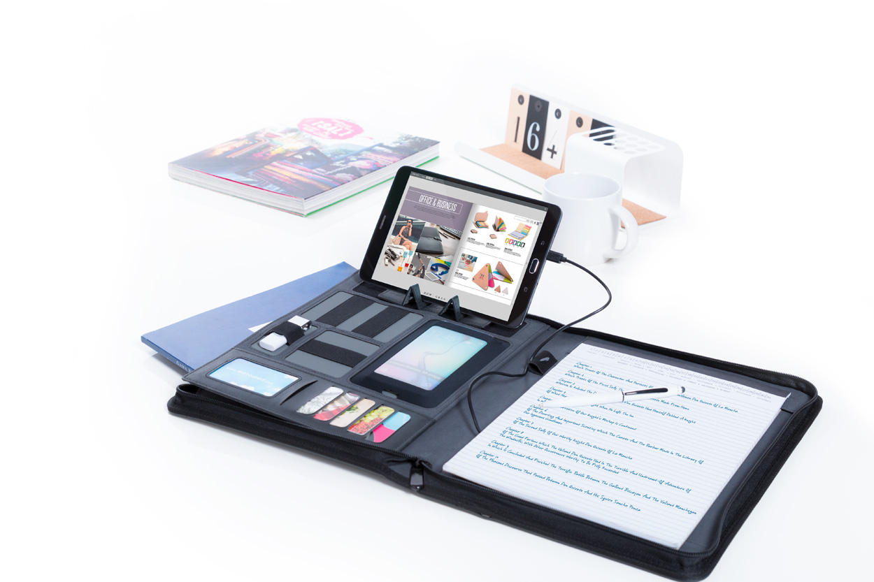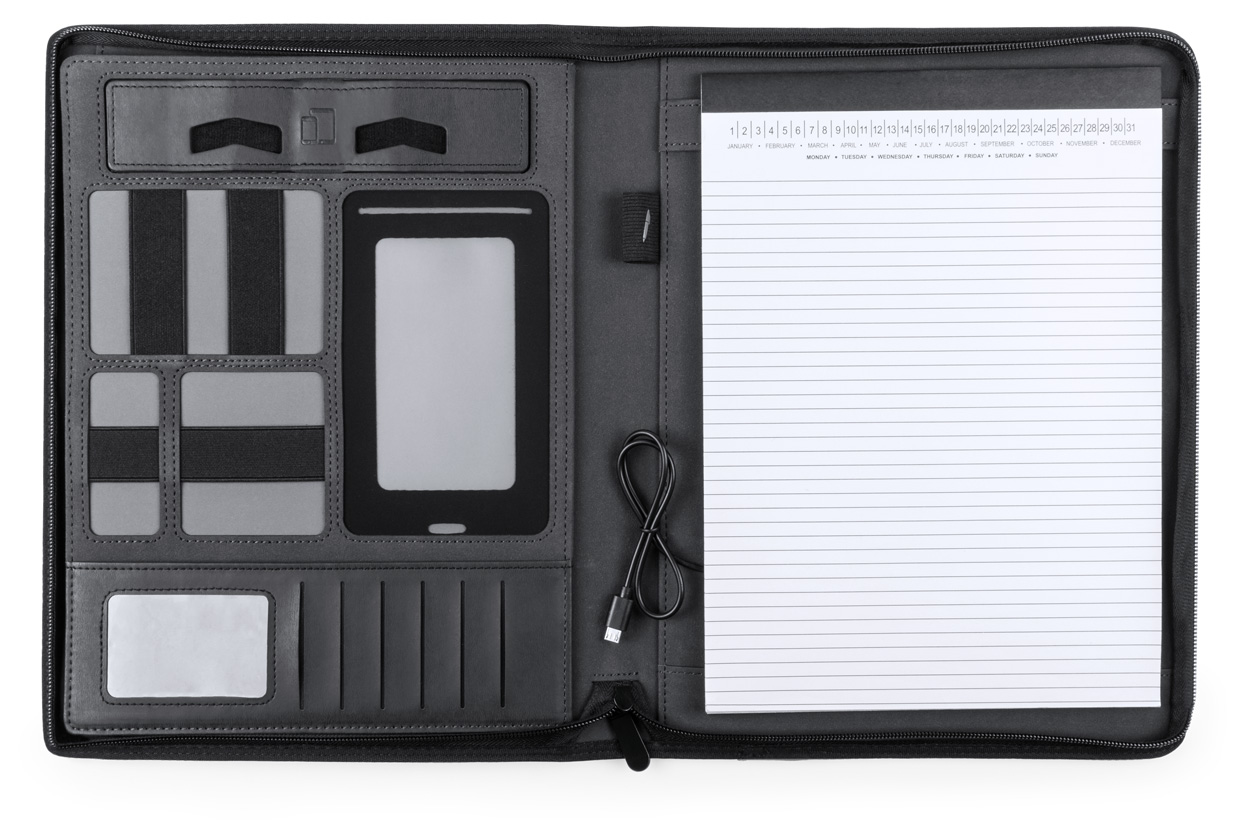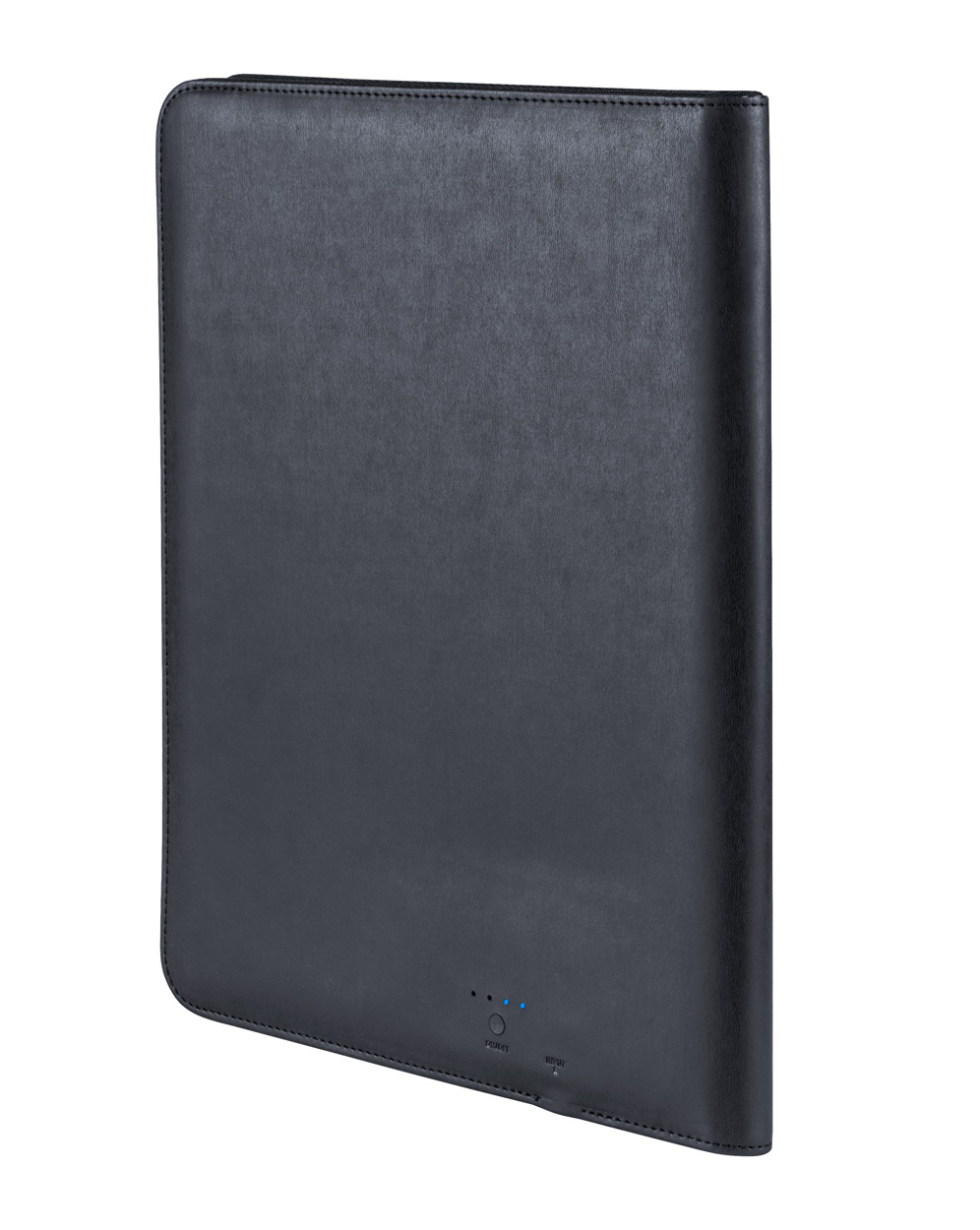 Sloha na dokumenty z PU kůže s 5000 mAh power bankou, 20 listým blokem a stojánkem na tablet. Vč. nabíjecího USB kabelu. Více...
