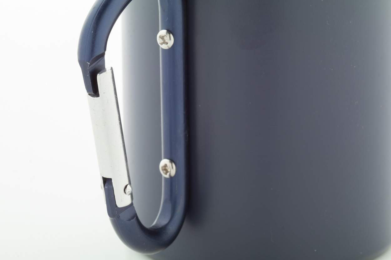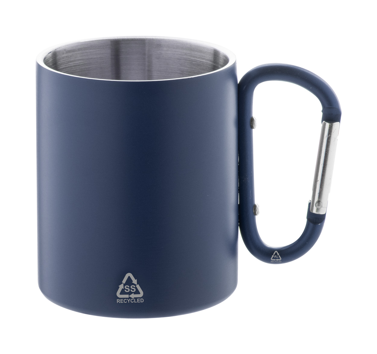 Dvoustěnný termo hrnek z recyklované nerezové oceli s karabinou z recyklovaného hliníku v odpovídající barvě. 300 ml. V kraftové papírové krabici.